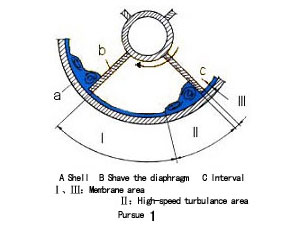 當待處理物料進入刮膜蒸發(fā)器后,先和轉(zhuǎn)子上的布料器相接觸,并被均勻地分配到內(nèi)筒壁,然后靠一組刮膜片加速并立即在加熱面上形成(0.5~3.5mm)的液膜;在每一組刮膜片前端(II區(qū))的流體形成一個渦流,在加熱面和葉片頂部之間間隙里的流體被高地湍動,并導(dǎo)致強烈傳熱和傳質(zhì),甚至高粘度產(chǎn)品在這湍動下產(chǎn)生高的熱傳遞系數(shù)。