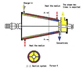 物料從大直徑端連續(xù)不斷地進入臥式蒸發(fā)器,被刮膜片加速和分配并立即在加熱面上形成一個薄的流動膜。